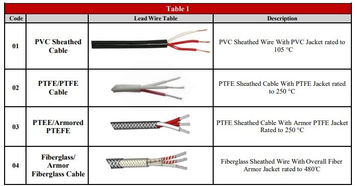 در جدول زیر انواع روکش و تحمل های دمایی مختلف سیم های RTD مشاهده می کنید.